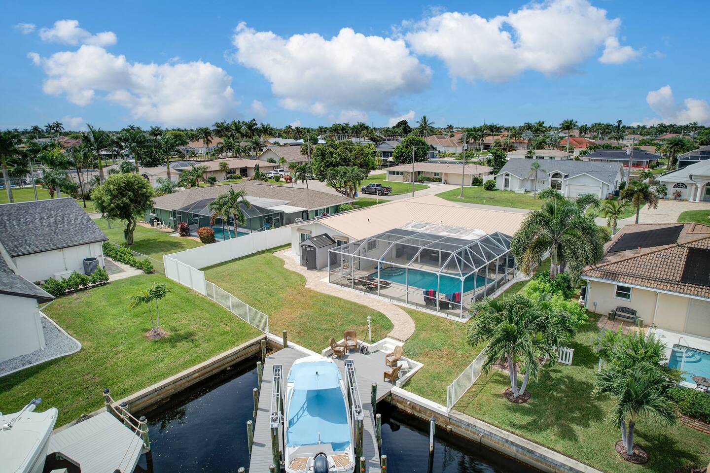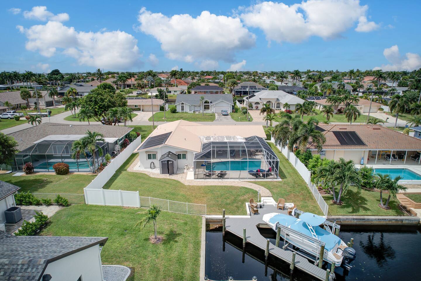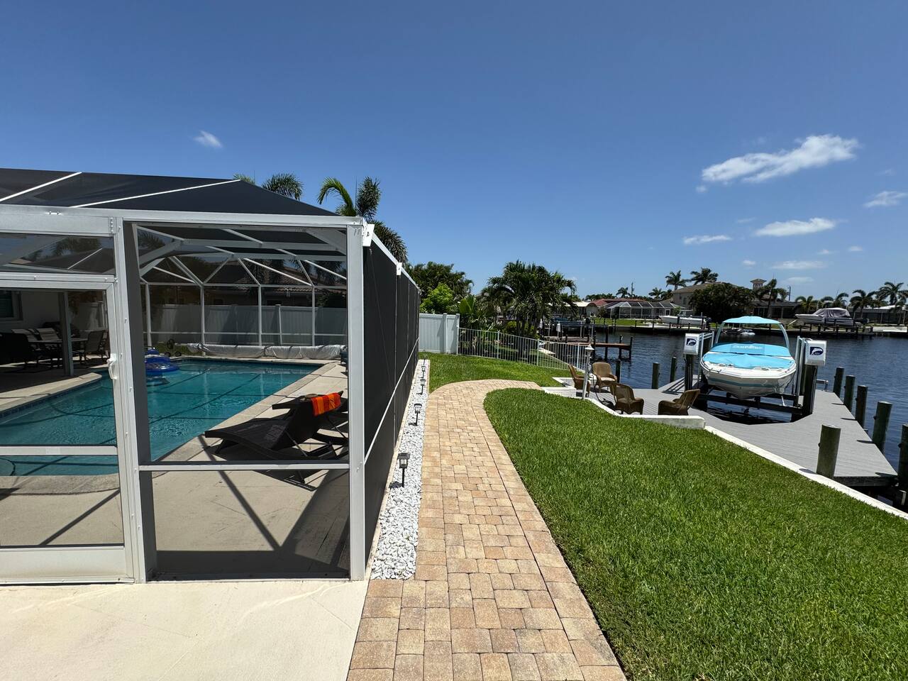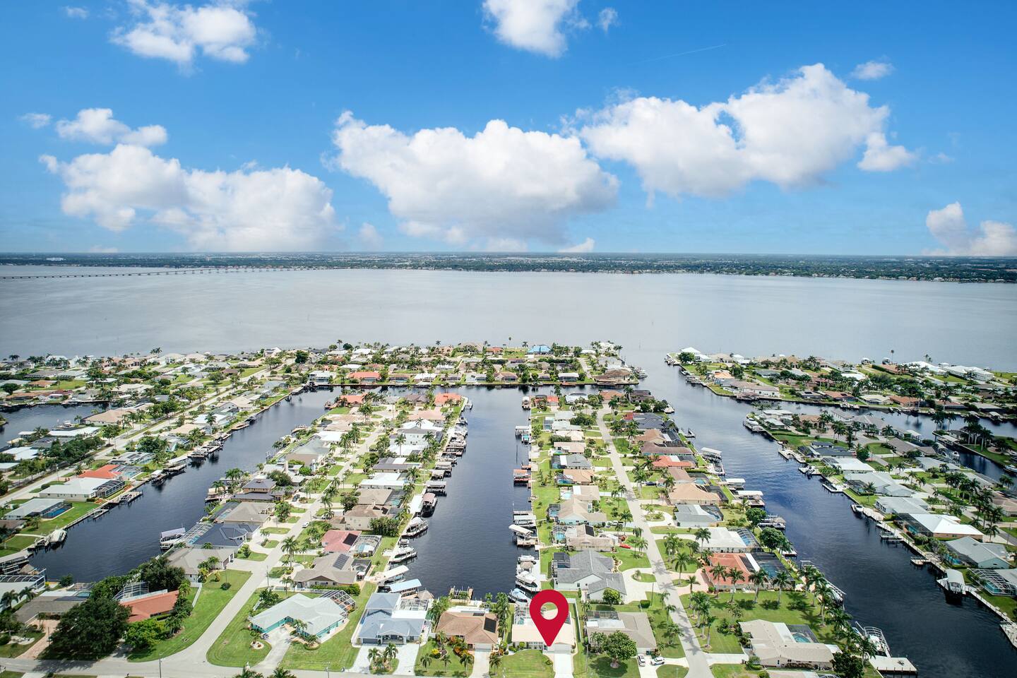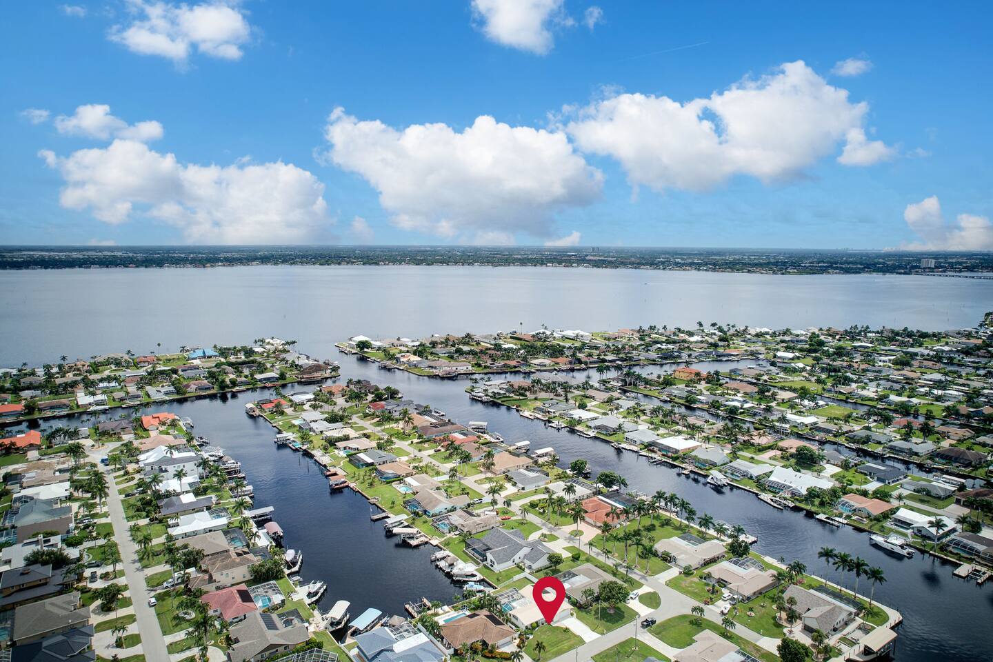 🌴 Peaceful Waterfront Escape in Cape Coral Welcome to your peaceful waterfront getaway in Cape Coral’s beautiful Southeast quadrant — just minutes from Fort Myers and with 5-minute Gulf access for endless days on the water. Bring your own boat or rent ours right from the dock and set out for a day of fishing, island hopping, or watching dolphins play! This spacious 4-bedroom, 3-bath home sleeps 8 comfortably and is designed for relaxation, fun, and making memories. The open layout connects the bright living room, modern kitchen, and dining area, creating the perfect flow for families and friends to gather. Step outside to your private screened-in pool and large patio, complete with outdoor dining, a grill, and a flat-screen TV — ideal for enjoying the game while soaking up the Florida sunshine. When it’s time to unwind, the air-conditioned game room offers a cool retreat with entertainment for all ages. ⸻ 🏠 Bedrooms & Bathrooms • Primary Suite: King bed, ensuite bath, water views, and private patio access • Guest Room 2: Queen bed, bright and cozy • Guest Room 3: Queen bed, perfect for couples • Guest Room 4: Two twin beds — great for kids or friends • Bathrooms: 3 full baths stocked with towels and essentials ⸻ 🍳 Kitchen & Dining A fully equipped kitchen with stainless steel appliances, cookware, and all the essentials you’ll need. Enjoy breakfast at the island bar or dinner at the indoor dining table overlooking the pool and canal. ⸻ 🌅 Outdoor Living • Private screened-in pool • Spacious patio for alfresco dining & grilling • Outdoor TV & lounge area • Canal access with boat dock & lift • Peaceful water views perfect for morning coffee or sunset cocktails ⸻ 📍 Discover the Area Experience all that Cape Coral and Fort Myers have to offer — your waterfront home is close to everything! • 🐬 Dolphin & Sunset Tours – 5–10 min Launch from nearby marinas for unforgettable wildlife encounters and sunset cruises. • 🍹 Waterfront Dining – 5–15 min Visit Rumrunners (10 min), The Boathouse (12 min), Fathoms (14 min), and Marker 92 (15 min) for food with a view. • 🏖️ Beaches – 25–35 min • Fort Myers Beach: 30 min • Sanibel Island: 35 min • Lovers Key State Park: 35 min • 🛥️ Boating Adventures – 5 min to Gulf access Cruise the Caloosahatchee River for island hopping, fishing, and dolphin spotting. • 🌳 Nature & Parks – 10–20 min • Four Mile Cove Ecological Preserve: 10 min • Rotary Park Environmental Center: 15 min • Lakes Park (Fort Myers): 20 min • 🛍️ Shopping & Entertainment – 10–25 min • Cape Coral Parkway Shops & Dining: 10 min • The Forum (Fort Myers): 20 min • Gulf Coast Town Center: 25 min • ⛳ Golf & Family Fun – 15–20 min • Coral Oaks Golf Course: 18 min • Sun Splash Family Waterpark: 15 min • Jungle Golf (Fort Myers): 20 min Whether you’re here to relax, explore, or play, everything Southwest Florida offers is right at your fingertips — all within a short drive from your Cape Coral retreat! ⸻ 🚗 Getting Around A car is highly recommended to make the most of your stay in Cape Coral and the surrounding Gulf Coast area. The neighborhood is peaceful and residential, yet conveniently close to restaurants, shopping, and attractions. • 🚙 Downtown Cape Coral: 10–12 min • 🌉 Fort Myers River District: 15–18 min • ✈️ Southwest Florida Intl. Airport (RSW): 30–35 min • 🏖️ Fort Myers Beach: 30 min • 🏝️ Sanibel Island: 35 min • ⛽ Gas stations, groceries, and local shops: Within 5–8 min Ride-share options like Uber and Lyft are readily available, and local marinas offer boat rentals and charters if you’d like to explore by water. With easy access to Del Prado Blvd and Cape Coral Parkway, you’ll be perfectly situated for beaches, shopping, and day trips throughout Southwest Florida.