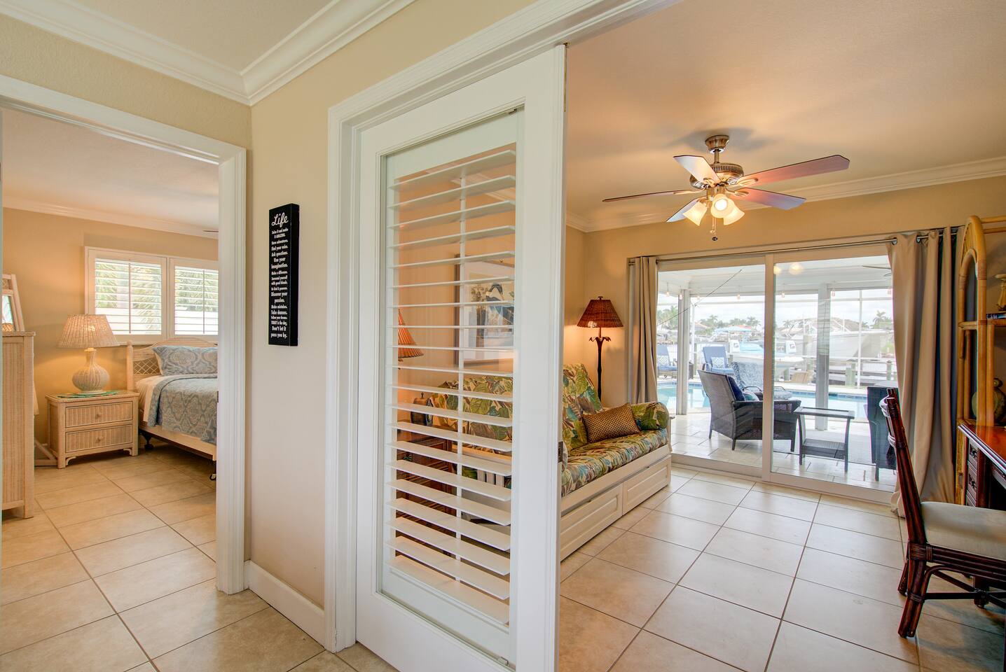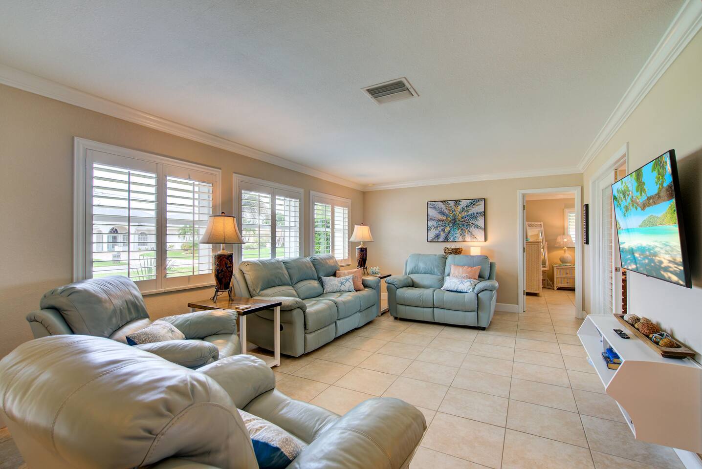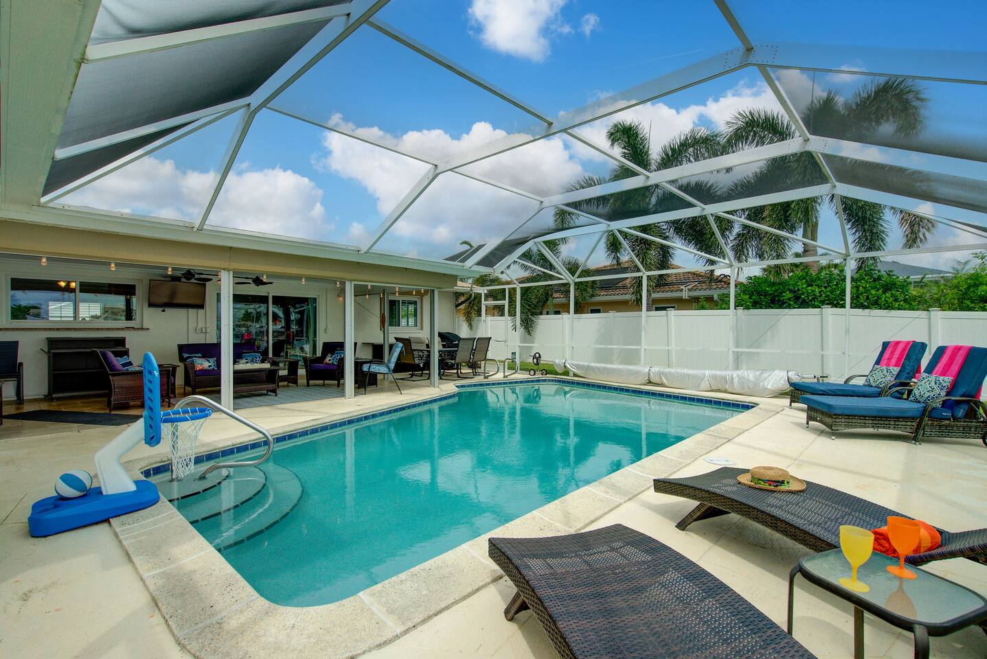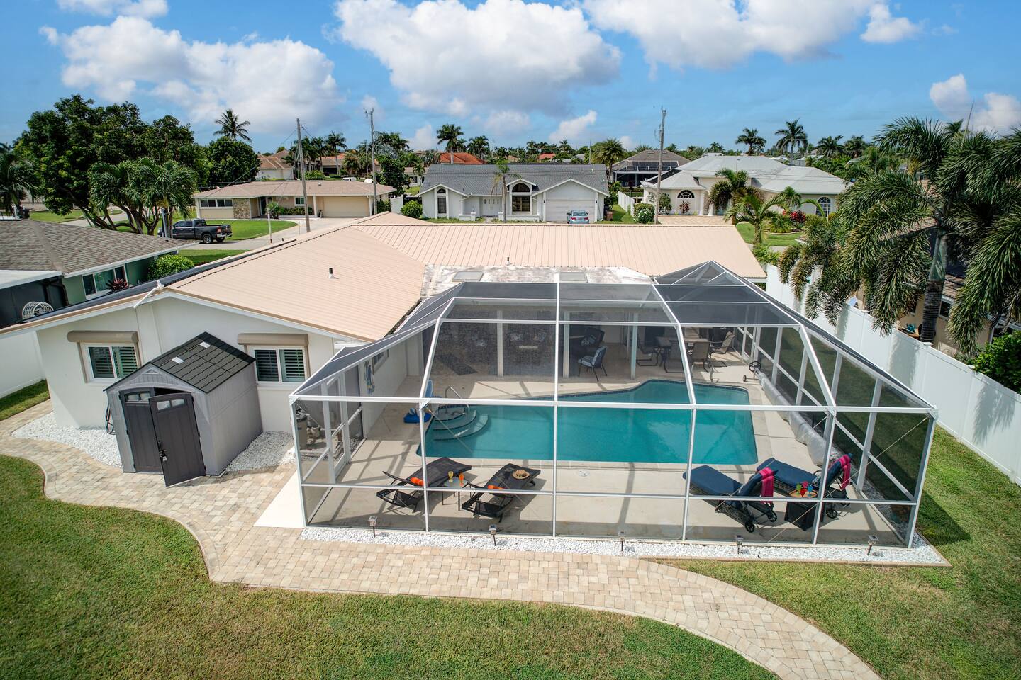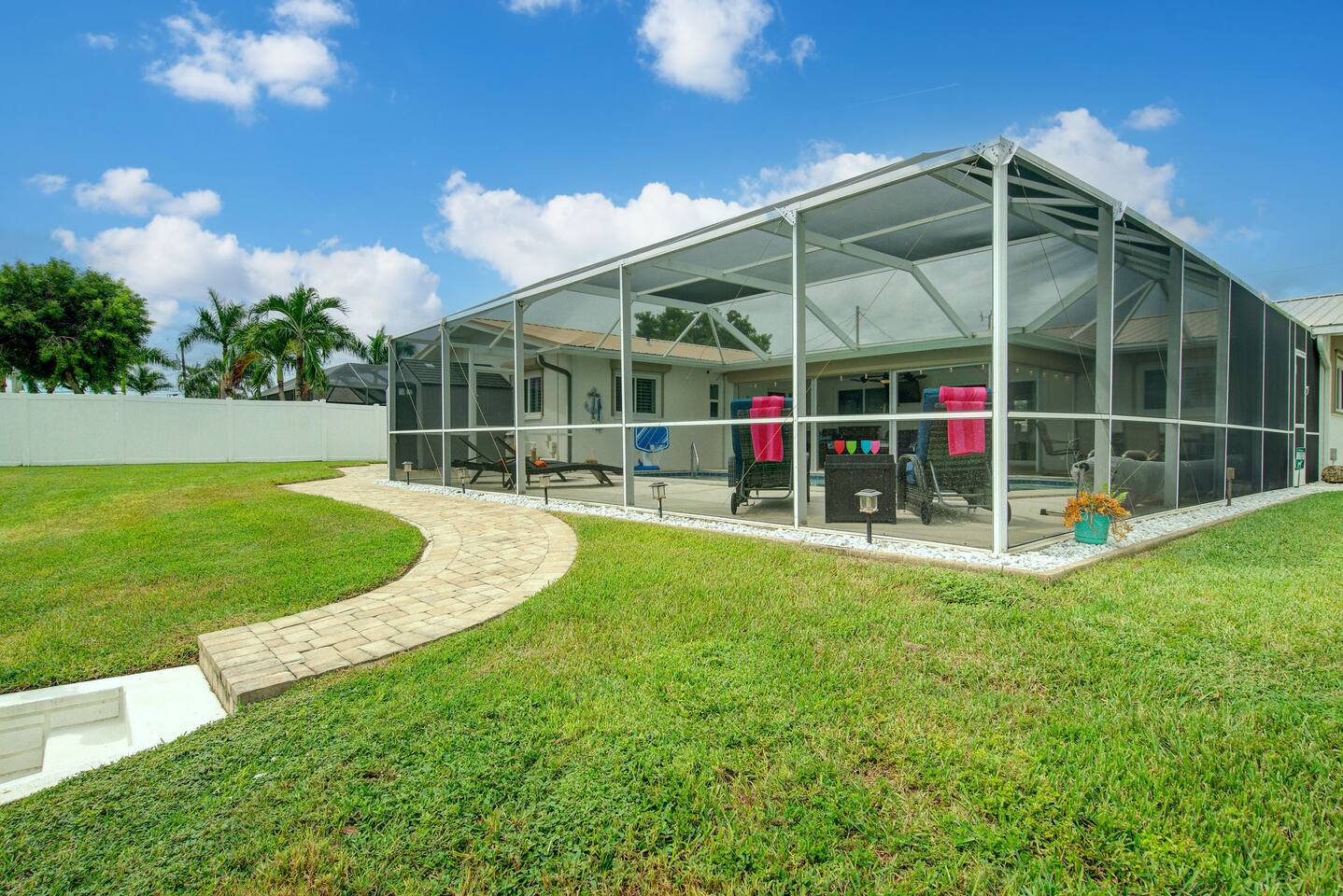 🌴 Peaceful Waterfront Escape in Cape Coral Welcome to your peaceful waterfront getaway in Cape Coral’s beautiful Southeast quadrant — just minutes from Fort Myers and with 5-minute Gulf access for endless days on the water. Bring your own boat or rent ours right from the dock and set out for a day of fishing, island hopping, or watching dolphins play! This spacious 4-bedroom, 3-bath home sleeps 8 comfortably and is designed for relaxation, fun, and making memories. The open layout connects the bright living room, modern kitchen, and dining area, creating the perfect flow for families and friends to gather. Step outside to your private screened-in pool and large patio, complete with outdoor dining, a grill, and a flat-screen TV — ideal for enjoying the game while soaking up the Florida sunshine. When it’s time to unwind, the air-conditioned game room offers a cool retreat with entertainment for all ages. ⸻ 🏠 Bedrooms & Bathrooms • Primary Suite: King bed, ensuite bath, water views, and private patio access • Guest Room 2: Queen bed, bright and cozy • Guest Room 3: Queen bed, perfect for couples • Guest Room 4: Two twin beds — great for kids or friends • Bathrooms: 3 full baths stocked with towels and essentials ⸻ 🍳 Kitchen & Dining A fully equipped kitchen with stainless steel appliances, cookware, and all the essentials you’ll need. Enjoy breakfast at the island bar or dinner at the indoor dining table overlooking the pool and canal. ⸻ 🌅 Outdoor Living • Private screened-in pool • Spacious patio for alfresco dining & grilling • Outdoor TV & lounge area • Canal access with boat dock & lift • Peaceful water views perfect for morning coffee or sunset cocktails ⸻ 📍 Discover the Area Experience all that Cape Coral and Fort Myers have to offer — your waterfront home is close to everything! • 🐬 Dolphin & Sunset Tours – 5–10 min Launch from nearby marinas for unforgettable wildlife encounters and sunset cruises. • 🍹 Waterfront Dining – 5–15 min Visit Rumrunners (10 min), The Boathouse (12 min), Fathoms (14 min), and Marker 92 (15 min) for food with a view. • 🏖️ Beaches – 25–35 min • Fort Myers Beach: 30 min • Sanibel Island: 35 min • Lovers Key State Park: 35 min • 🛥️ Boating Adventures – 5 min to Gulf access Cruise the Caloosahatchee River for island hopping, fishing, and dolphin spotting. • 🌳 Nature & Parks – 10–20 min • Four Mile Cove Ecological Preserve: 10 min • Rotary Park Environmental Center: 15 min • Lakes Park (Fort Myers): 20 min • 🛍️ Shopping & Entertainment – 10–25 min • Cape Coral Parkway Shops & Dining: 10 min • The Forum (Fort Myers): 20 min • Gulf Coast Town Center: 25 min • ⛳ Golf & Family Fun – 15–20 min • Coral Oaks Golf Course: 18 min • Sun Splash Family Waterpark: 15 min • Jungle Golf (Fort Myers): 20 min Whether you’re here to relax, explore, or play, everything Southwest Florida offers is right at your fingertips — all within a short drive from your Cape Coral retreat! ⸻ 🚗 Getting Around A car is highly recommended to make the most of your stay in Cape Coral and the surrounding Gulf Coast area. The neighborhood is peaceful and residential, yet conveniently close to restaurants, shopping, and attractions. • 🚙 Downtown Cape Coral: 10–12 min • 🌉 Fort Myers River District: 15–18 min • ✈️ Southwest Florida Intl. Airport (RSW): 30–35 min • 🏖️ Fort Myers Beach: 30 min • 🏝️ Sanibel Island: 35 min • ⛽ Gas stations, groceries, and local shops: Within 5–8 min Ride-share options like Uber and Lyft are readily available, and local marinas offer boat rentals and charters if you’d like to explore by water. With easy access to Del Prado Blvd and Cape Coral Parkway, you’ll be perfectly situated for beaches, shopping, and day trips throughout Southwest Florida.